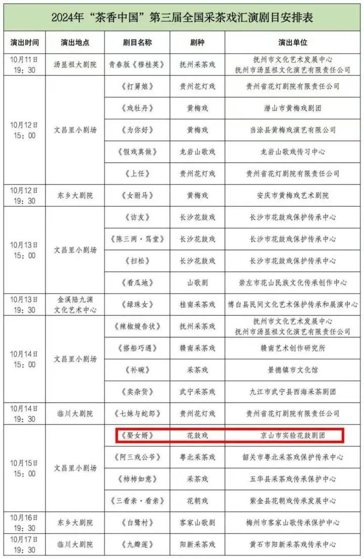 2024年“茶香中国”第三届全国采茶戏汇演由文化和旅游部艺术司、江西省文化和旅游厅、抚州市人民政府主办,于10月11日至17日在江西抚州举办,来自安徽、福建、江西、湖北、湖南、广东、广西、贵州等省/自治区18个院团的23个剧目(6个大戏、17个小戏)参与汇演,为广大群众献上一场丰富多彩的戏曲盛宴。